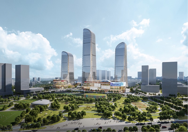 公司参与设计的55、57号地块项目位于石家庄高铁片区商务核心区,正对石家庄站东广场,项目总规划用地面积106.35亩,设计以“山石为形”、取“昂扬向上”之意,由一主两副三塔和裙房组成,建成后将成为石家庄市第一高楼。其中,57号地块总建筑面积45.9万平方米,规划建设主塔高258米,副塔高200米;55号地块总建筑面积20.6万平方米,规划建设塔楼高180米。项目通过空中连桥、地下商业与地铁联通,打造高品质购物、娱乐的多维立体商圈,建成后将成为集高端购物、会议展览、商务办公、休闲住宿等多功能于一体的地标建筑,重塑城市天际线,成为石家庄市经济提升新动能。